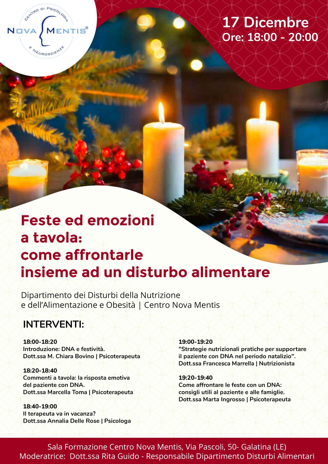 Il 17 dicembre 2025, tra le ore 18.00 e le ore 20.00 si svolgerà presso il Centro NOVA MENTIS di Galatina l’incontro sulle tematiche che affrontano i disturbi alimentari. Al convegno parteciperà come relatrice la nostra socia, Dott.ssa Chiara Bovino Psicoterapeuta che introdurrà l’evento argomentando sul DNA (Disturbi della Nutrizione Alimentare) e festività, essendo la chermesse incentrata sull’incrocio tra le festività natalizie e le emozioni da tavola. L’evento vedrà alternarsi quali relatori altri professionisti della materia, Dott.ssa Marcella TOMA Psicoterapeuta; Dott.ssa Annalia DELLE ROSE Psicologa; Dott.ssa Francesca Marrella, Nutrizionista; Dott.ssa Marta INGROSSO Psicoterapeuta.